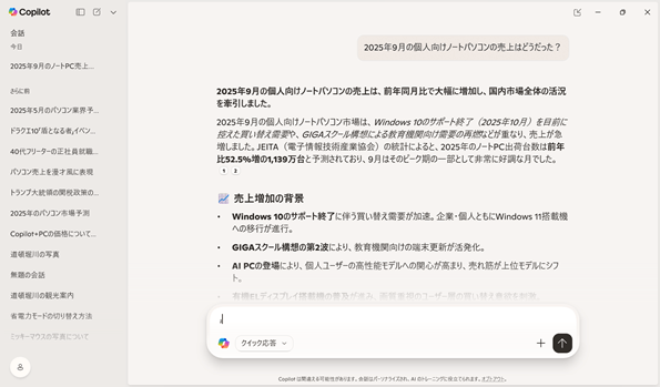 Ryzen 7 250搭載モデルは標準として「Copilot」というAIアシスタント機能がデフォルトで搭載されています。